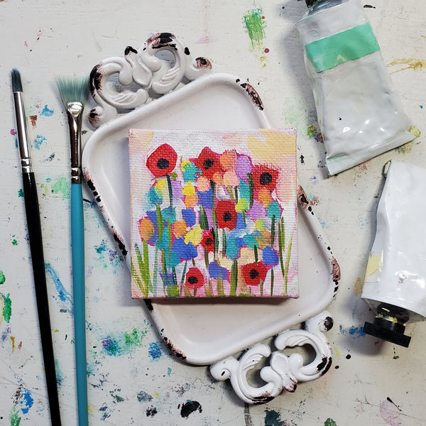 This mini painting measures 3x3 inches, and comes with a display easel. Perfect for a desktop area, or small shelf of treasures!